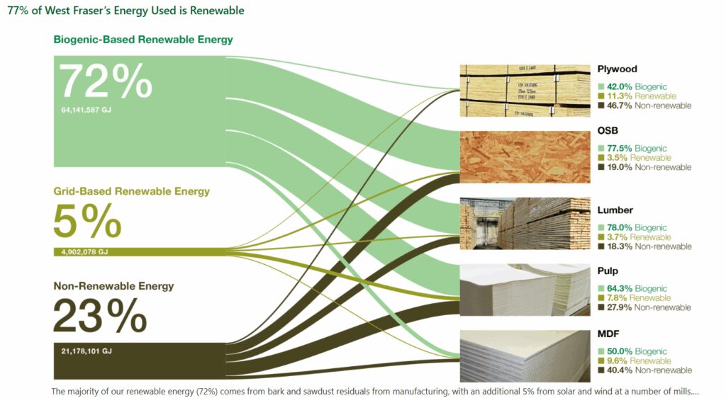 Approximately, 77% of West Fraser’s energy comes from renewable sources, and we generate 72% of our energy requirements from carbon-neutral biomass fuels sourced from our wood processing operations.