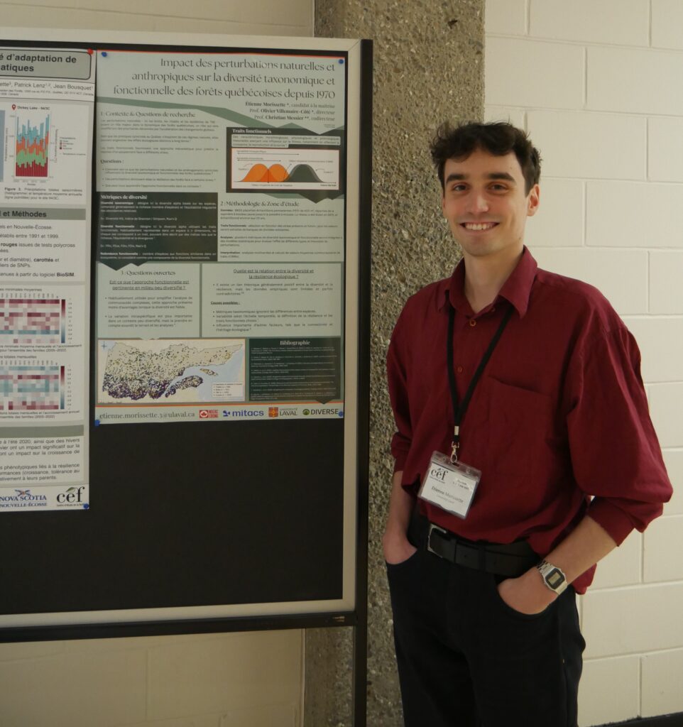 Enfin, Étienne Morrissette, étudiant à la maîtrise pour DIVERSE, a présenté une affiche sur son projet de recherche. Il entend étudier l'impact des perturbations naturelles et anthropiques sur la diversité taxonomique et fonctionnelle des forêts du Québec depuis 1970.