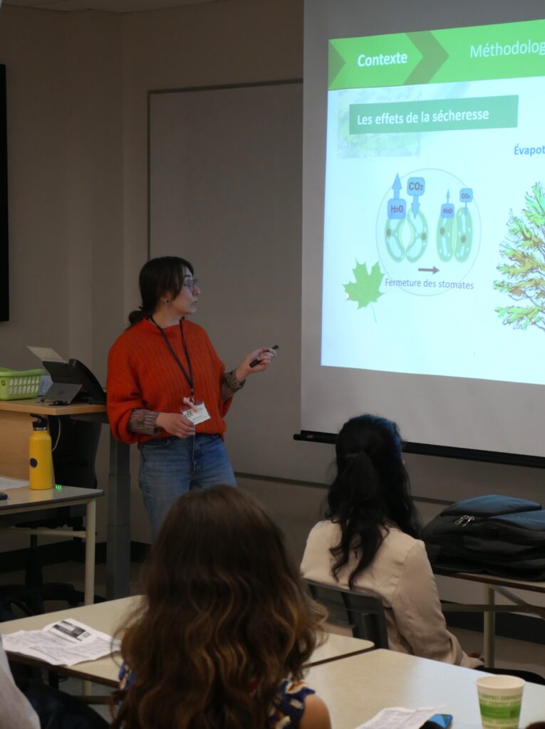 Zoé Ribeyre, postdoctorante, a présenté ses travaux sur l'impact des sécheresses estivales sur la production de sucre d'érable. L'équipe de recherche a mis en place une expérience d'exclusion de la pluie à Kenauk (Outaouais, Québec) afin de déterminer si des sécheresses répétées ont une incidence sur le volume et la teneur en sucre de la sève d'érable, ainsi que sur les réserves de sucre des racines. Leurs résultats montrent que les arbres soumis à la sécheresse produisent une sève dont la concentration en sucre est plus faible (0,25 Brix de moins), ce qui suggère que l'augmentation des sécheresses estivales pourrait avoir un impact sur la production de sirop d'érable.