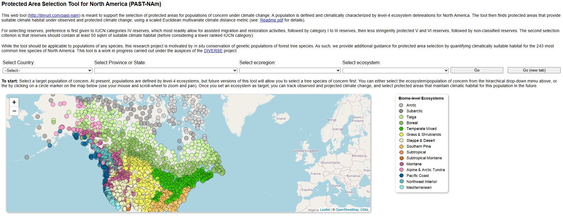 This web tool is meant to support the selection of protected areas for populations of concern under climate change. A population is defined and climatically characterized by level-4 ecosystem delineations for North America. The tool then finds protected areas that provide suitable climate habitat under observed and protected climate change, using a scaled Euclidean multivariate climate distance metric (see: Readme.pdf for details).